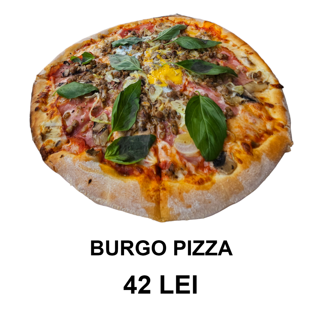 sos de roșii, mozzarella, bacon, carne de burger, ulei trufe, rozmarin, ciuperci, ceapă, ou – 32 CM/ 530g