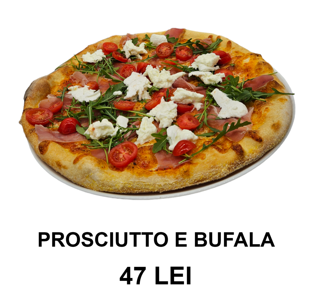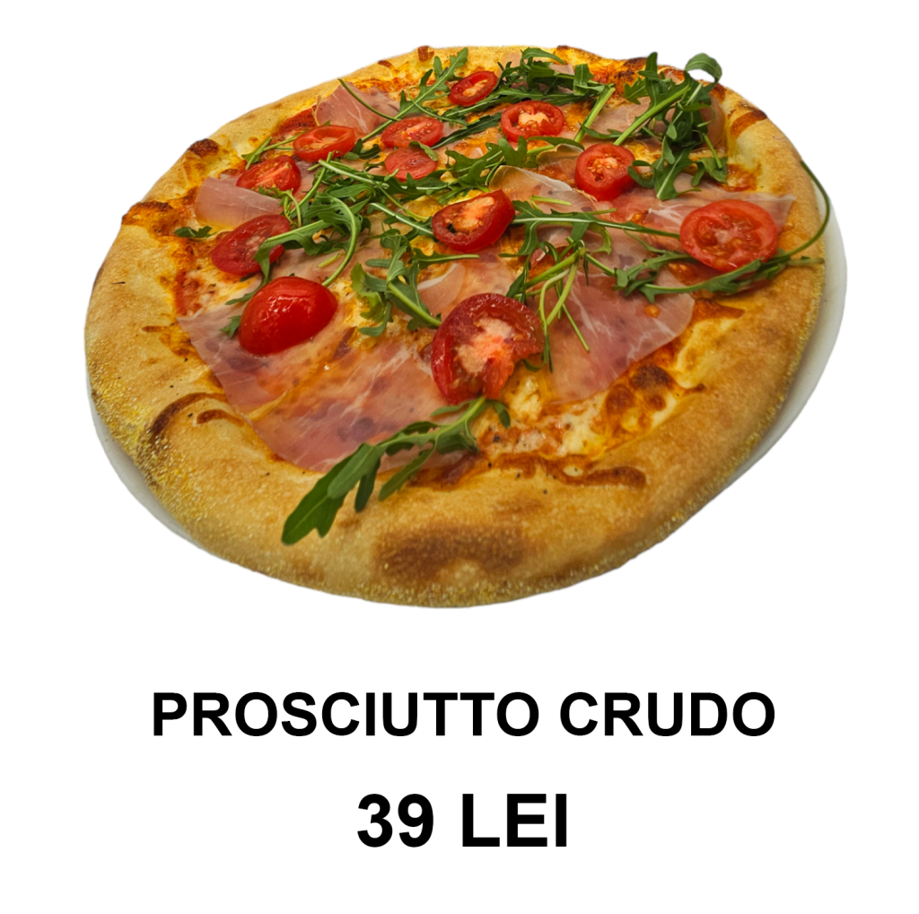 sos de roșii, mozzarella, prosciutto, rucola, roșii cherry, brânză de Bufala, parmezan – 32 CM/ 480g