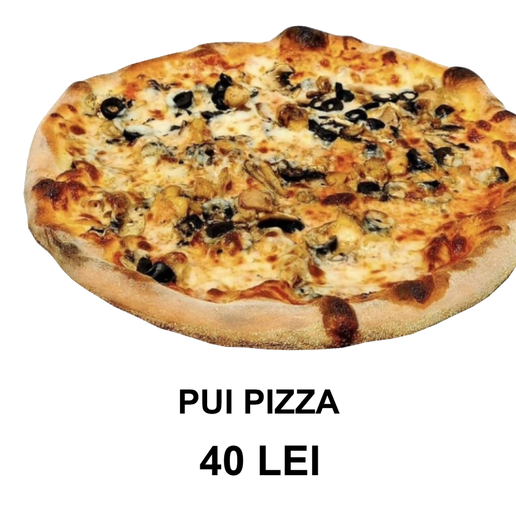ciuperci, măsline, sos de roșii, mozzarella, pui – 32 CM/ 500g
